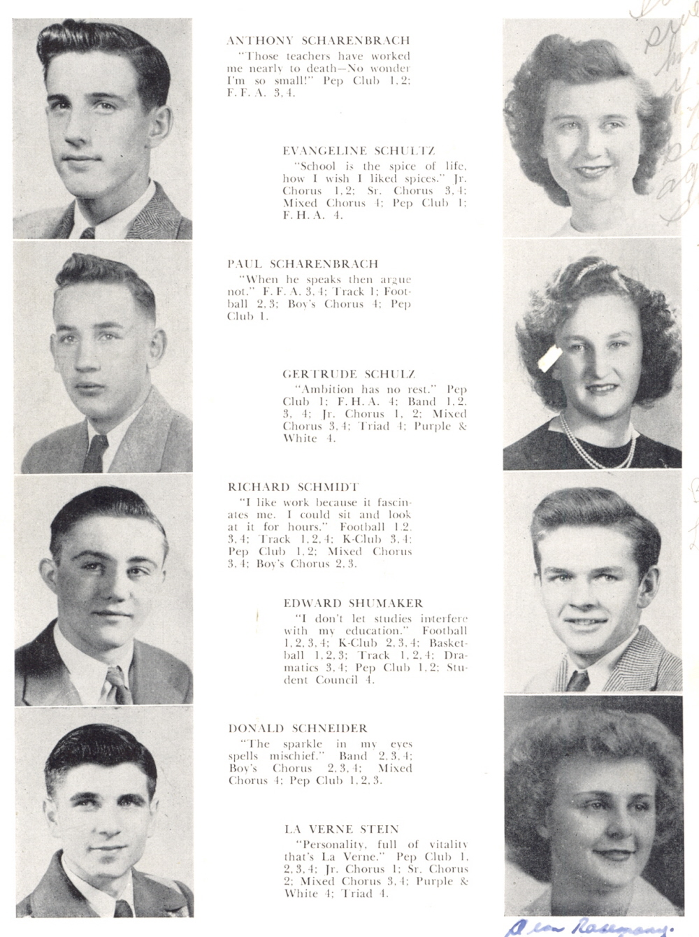 1948 Kiel High School, Page 18: Anthony Scharenbrach, Paul Scharenbrach, Richard Schmidt, Donald Schneider, Evangeline Schultz, Gertrude Schulz, Edward Shumaker, La Verne Stein.
