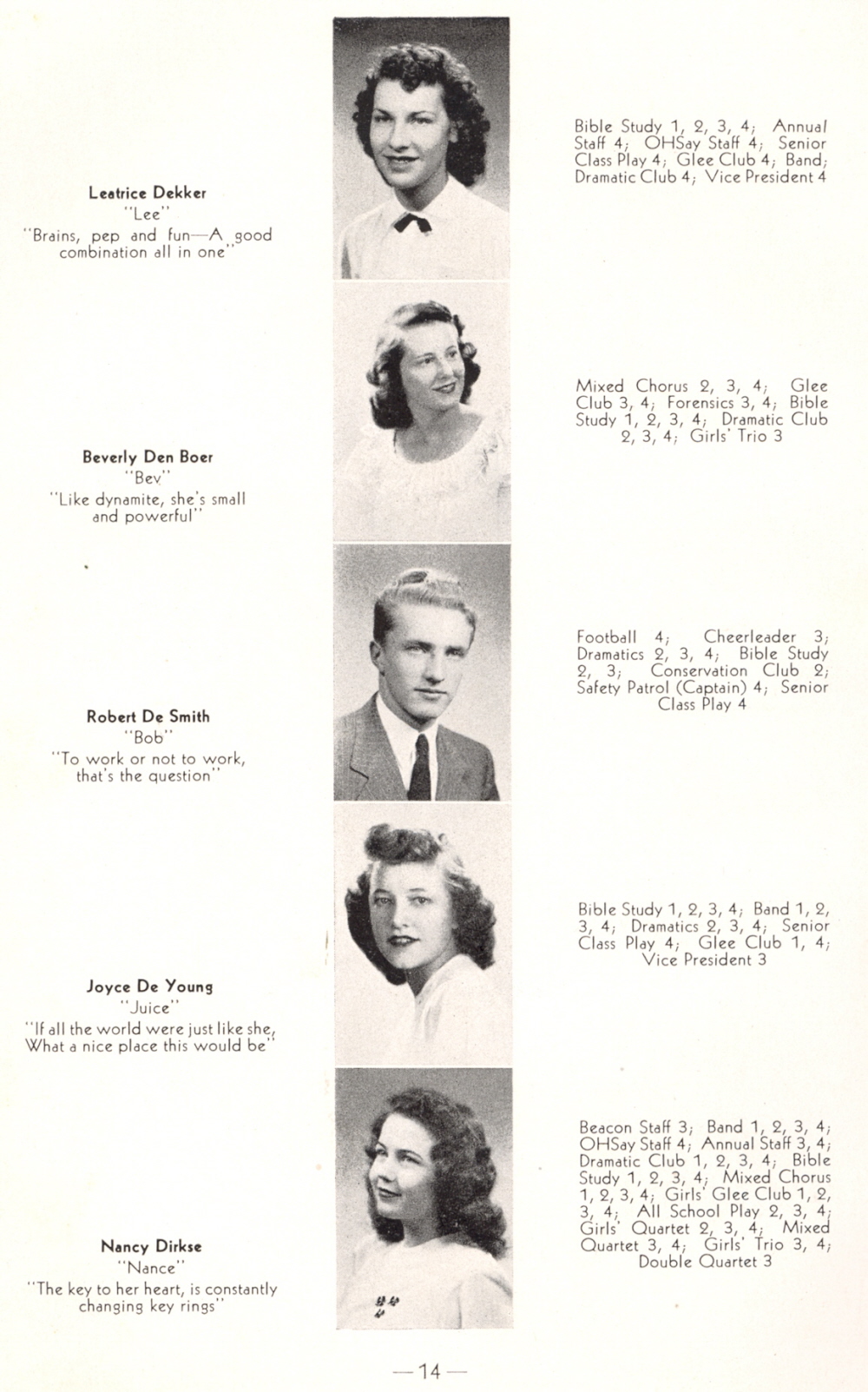 1948 Oostburg High School, Page 14: Leatrice Dekker, Beverly Den Boer, Robert De Smith, Joyce De Young, Nance Dirkse.