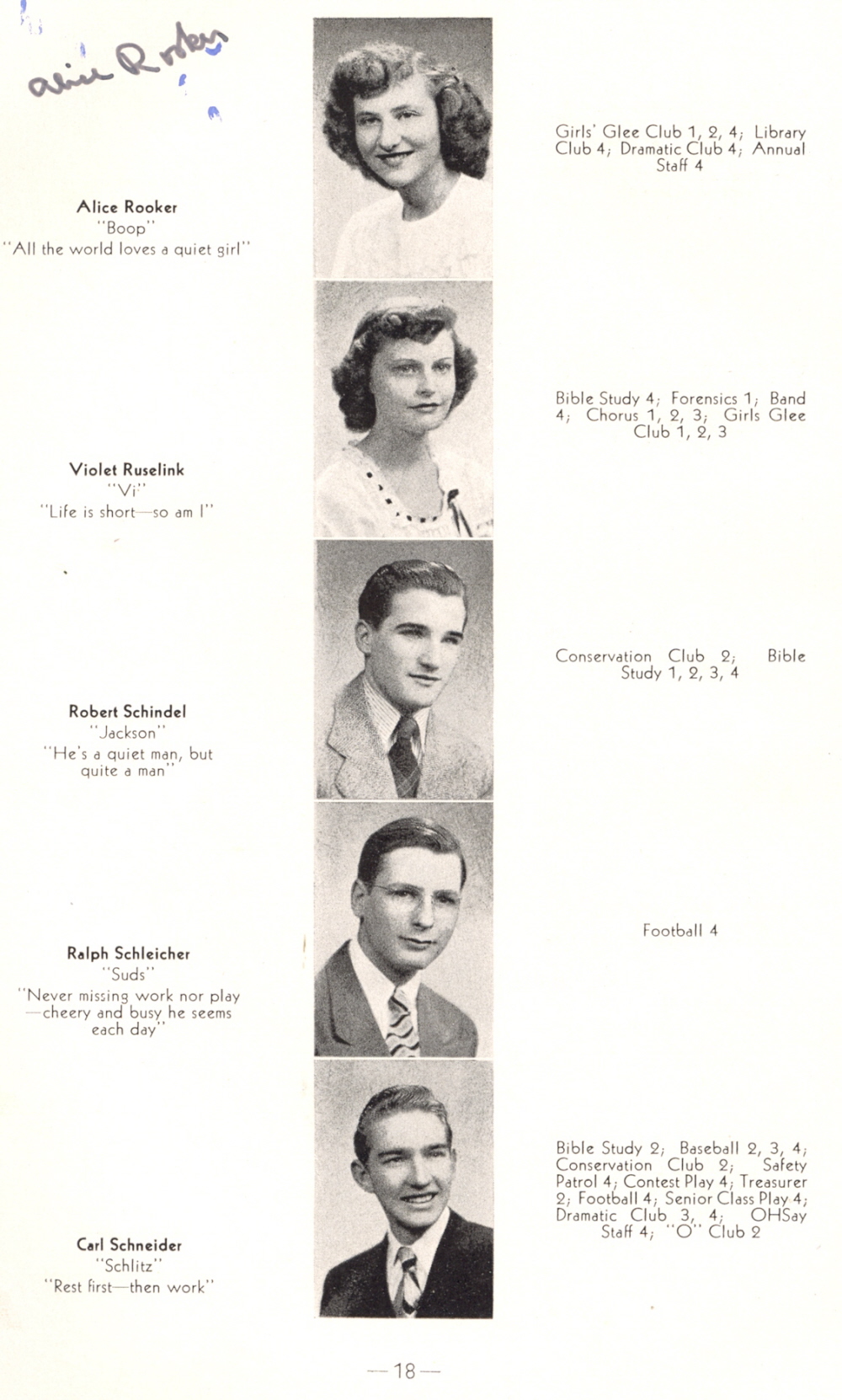 1948 Oostburg High School, Page 18: Alice Rooker, Violet Ruselink, Robert Schindel, Ralph Schleicher, Carl Schneider.