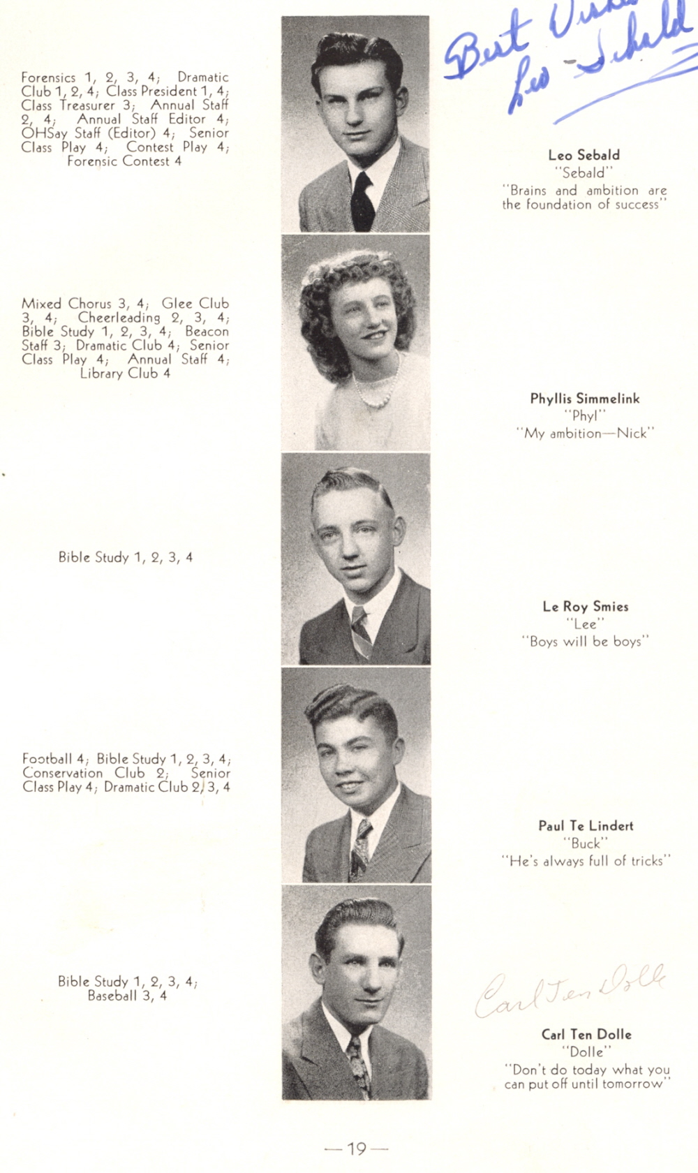 1948 Oostburg High School, Page 19: Leo Sebald, Phyllis Simmelink, Le Roy Smies, Paul Te Lindert, Carl Ten Dolle.