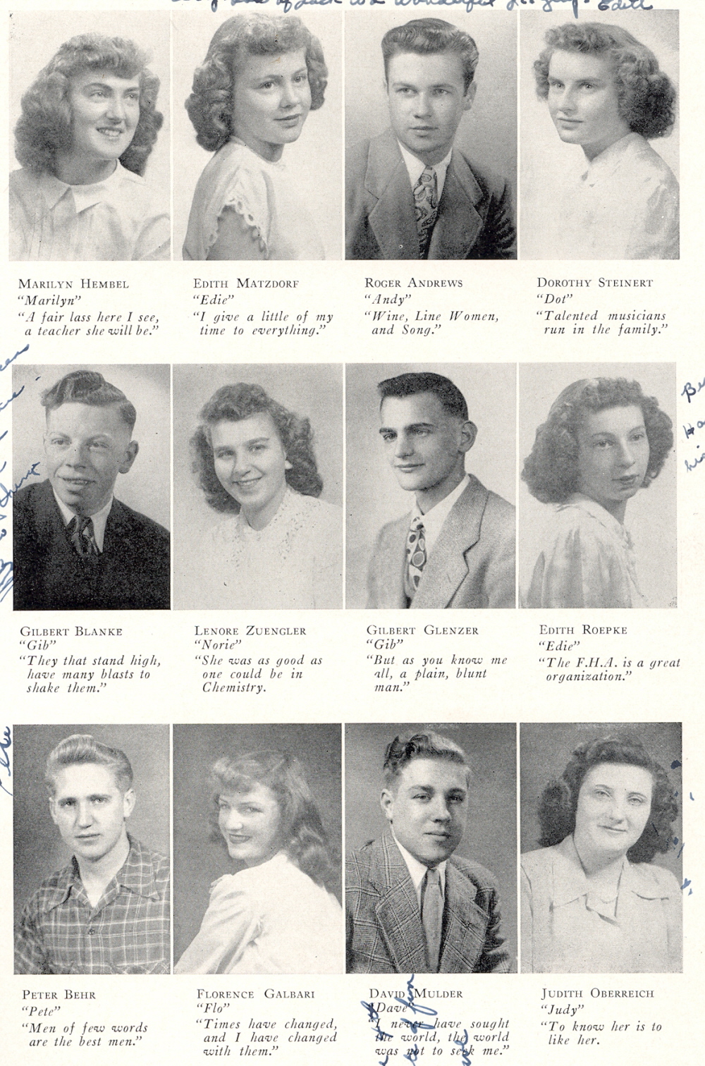 1948 Plymouth High School, Page 25: Marilyn Hembel, Edith Matzdorf, Rober Andrews, Dorothy Steinert, Gilbert Blanke, Lenore Zuengler, Gilbert Glenzer, Edith Roepke, Peter Behr, Florence Galbari, David Mulder, Judith Oberreich.