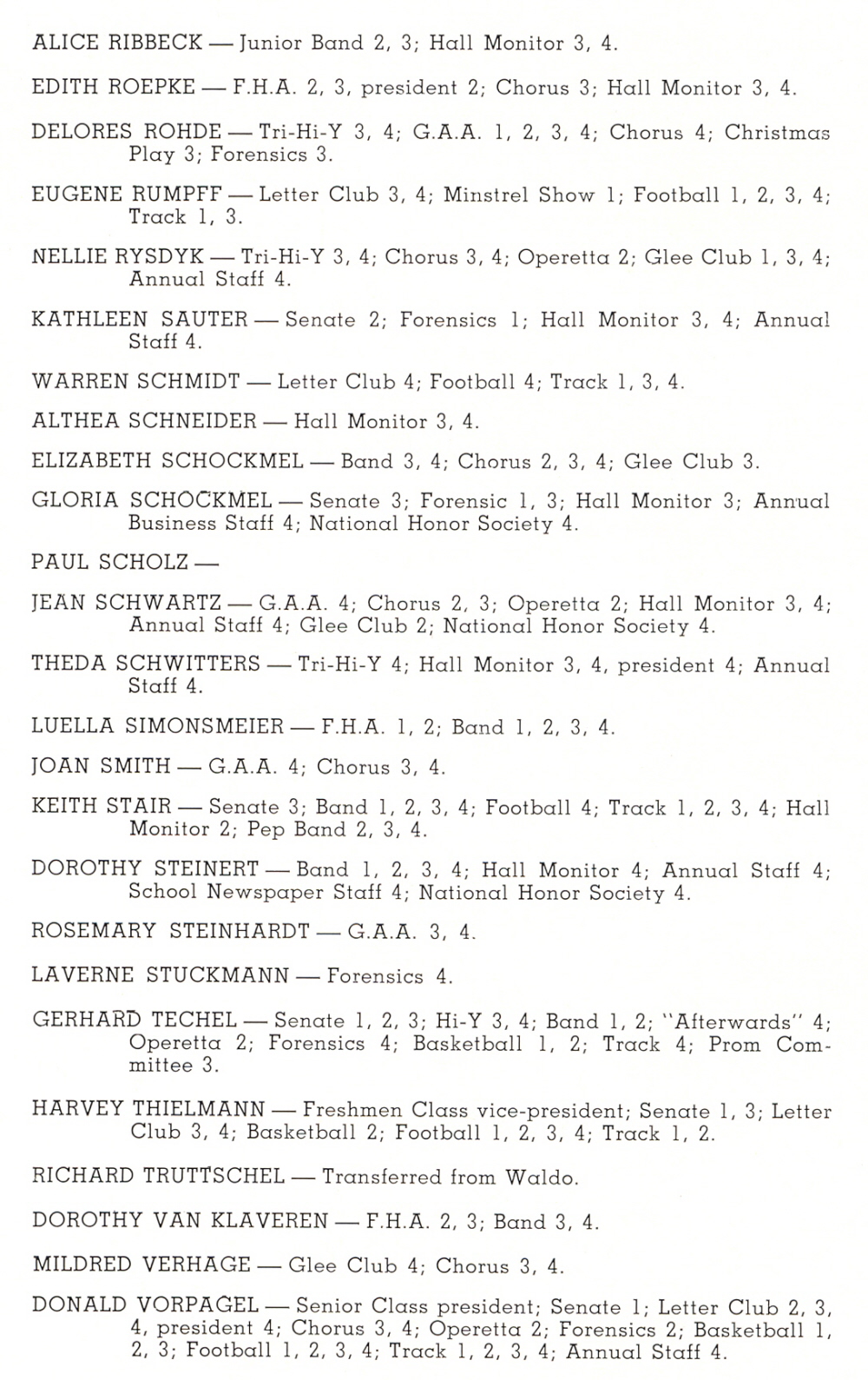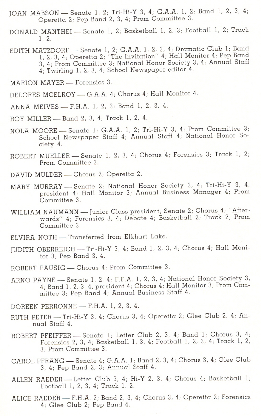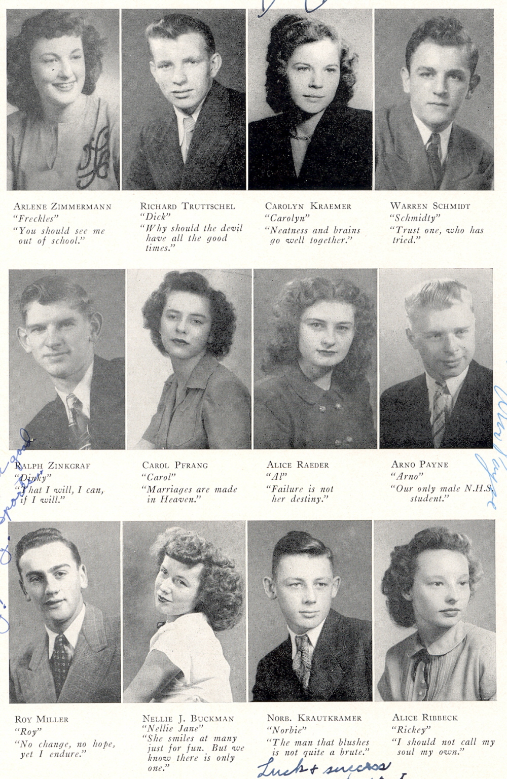 1948 Plymouth High School, Page 26: Arlene Zimmermann, Richard Truttschel, Carolyn Kraemer, Warren Schmidt, Ralph Zinkgraf, Carol Pfrang, Alice Raeder, Arno Payne, Roy Miller, Nellie Buckman, Norb. Krautkramer, Alice Ribbeck.