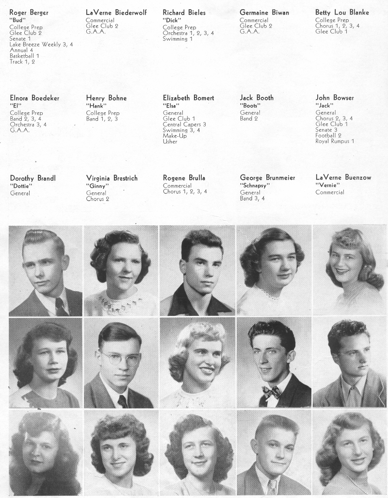 1948 Sheboygan Central High School, Page 24: Roger Berger, LaVerne Biederwolf, Richard Bieles, Germaine Biwan, Betty Lou Blanke, Elnora Boedeker, Henry Bohne, Elizabeth Bomert, Jack Booth, John Bowser, Dorothy Brandl, Virginia Brestrich, Rogene Brulla, George Brunmeier, LaVerne Buenzow.