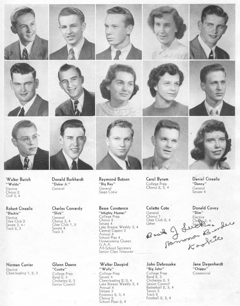 1948 Sheboygan Central High School, Page 25: Walter Burich, Donald Burkhardt, Raymond Butzen, Carol Byrum, Daniel Cinealis, Robert Cinealis, Charles Conrardy, Besse Constance, Colette Cote, Donald Covey, Norman Currier, Glenn Daane, Walter Daugird, John Debrouske, Jane Degenhardt.