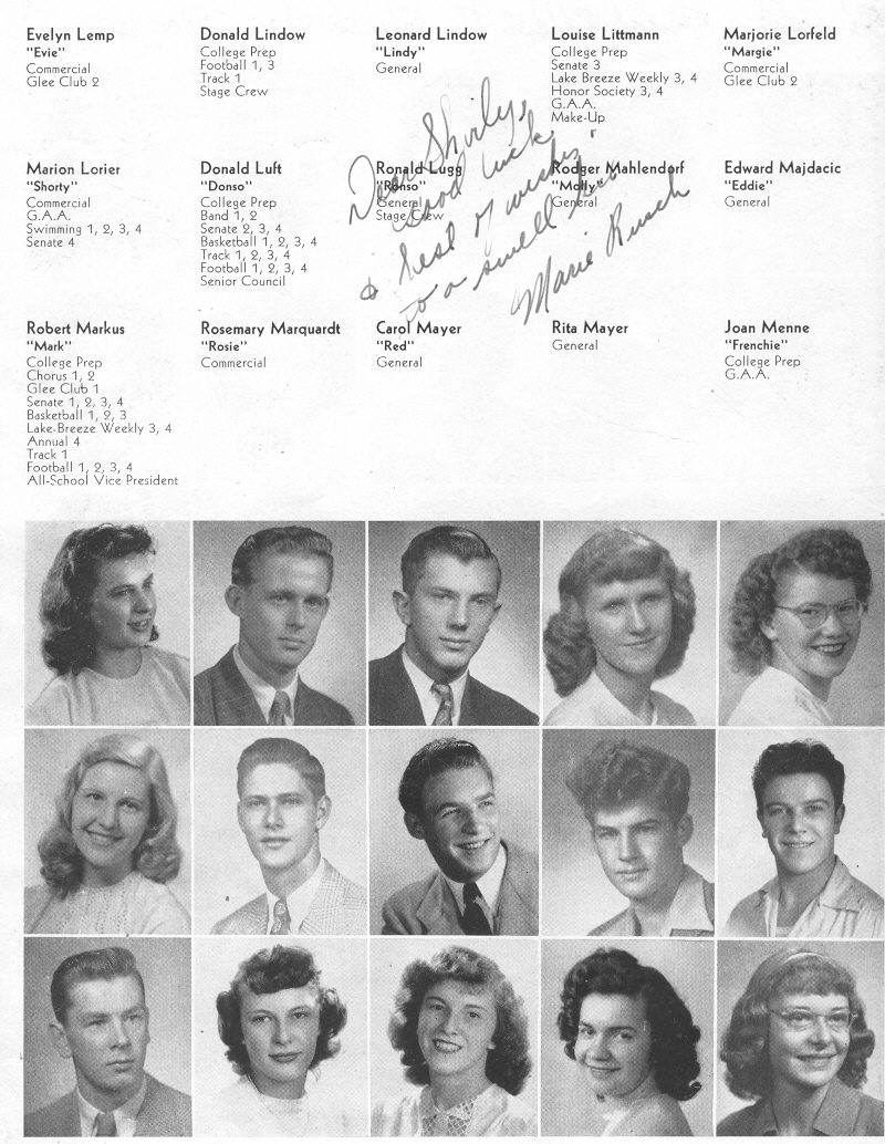 1948 Sheboygan Central High School, Page 34: Evelyn Lemp, Donald Lindow, Leonard Lindow, Louise Littmann, Marjorie Lorfeld, Marion Lorier, Donald Luft, Ronald Lugg, Rodger Mahlendorf, Edward Majdacic, Robert Markus, Rosemary Marquardt, Carol Mayer, Rita Mayer, Joan Menne.