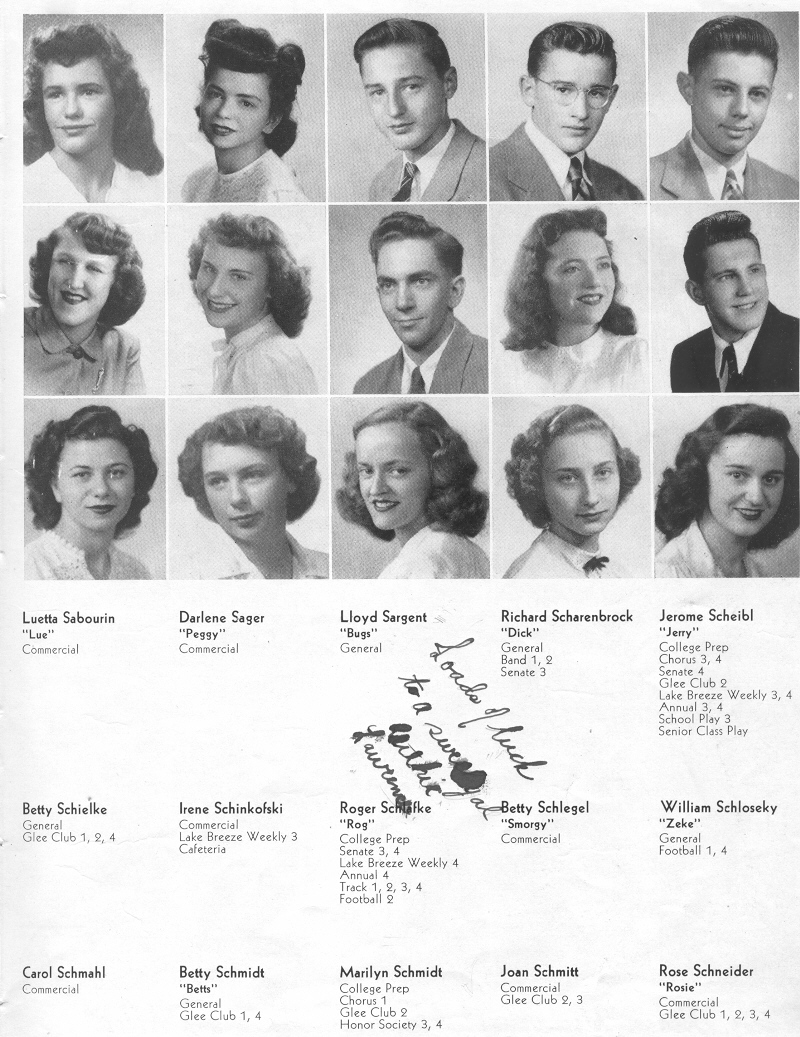 1948 Sheboygan Central High School, Page 39: Luetta Sabourin, Darlene Sager, Lloyd Sargent, Richard Scharenbrock, Jerome Scheibl, Betty Schielke, Irene Schinkofski, Roger Schlafke, Betty Schlegel, William Schloseky, Carol Schmahl, Betty Schmidt, Marilyn Schmidt, Joan Schmitt, Rose Schneider.