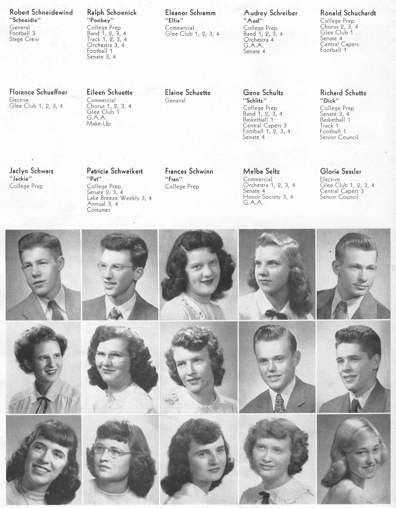 1948 Sheboygan Central High School, Page 40: Robert Schneidewind, Ralph Schoenick, Eleanor Schramm, Audrey Schreiber, Ronald Schuchardt, Florence Schueffner, Eileen Schuette, Elaine Schuette, Gene Schultz, Richard Schutte, Jaclyn Schwarz, Patricia Schweikert, Frances Schwinn, Melba Seltz, Gloria Sessler.
