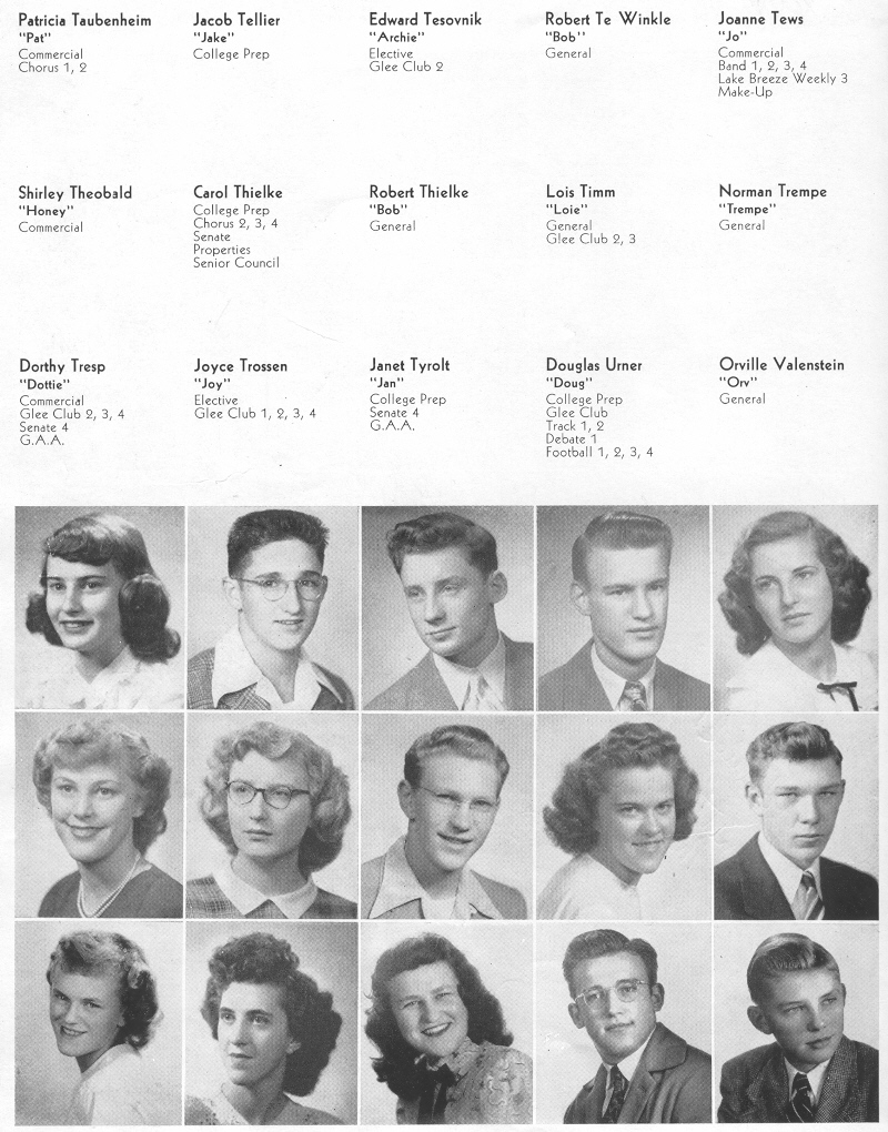 1948 Sheboygan Central High School, Page 42: Patricia Taubenheim, Jacob Tellier, Edward Tesovnik, Robert Te Winkle, Joanne Tews, Shirley Theobald, Carol Thielke, Robert Thielke, Lois Timm, Norman Trempe, Dorthy Tresp, Joyce Trossen, Janet Tyrolt, Douglas Urner, Orville Valenstein.