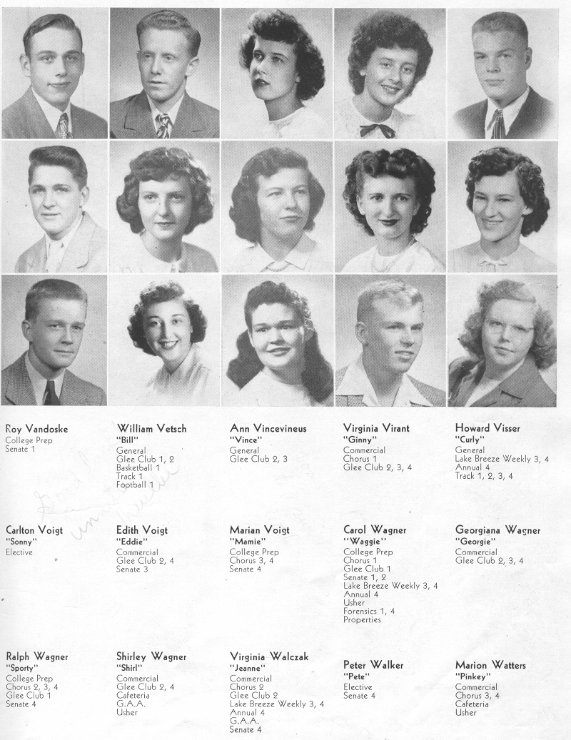 1948 Sheboygan Central High School, Page 43: Roy Valdoske, William Vetsch, Ann Vincevineus, Virginia Virant, Howard Visser, Carlton Voigt, Edith Voigt, Marian Voigt, Carol Wagner, Georgiana Wagner, Ralph Wagner, Shirley Wagner, Virginia Walczak, Peter Walker,Marion Watters.
