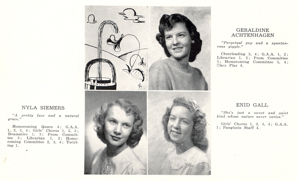 1948 Sheboygan Falls High School, Page 1: Geraldine Achtenhagen, Nyla Siemers, Enid Gall.