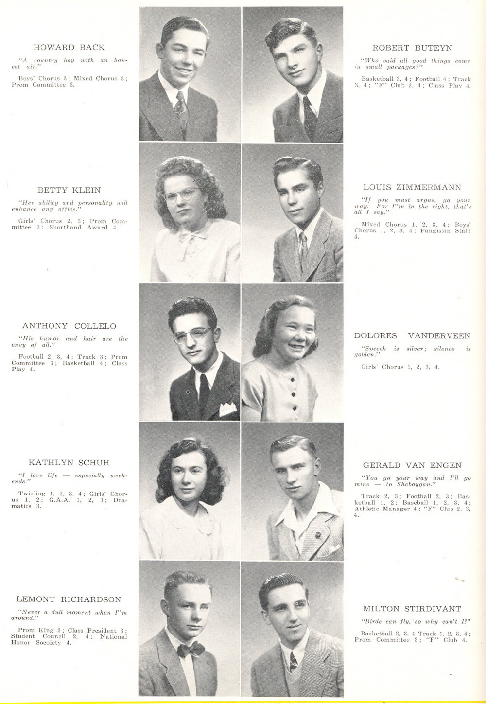 1948 Sheboygan Falls High School, Page 3: Howard Back, Robert Buteyn, Betty Klein, Louis Zimmermann, Anthony Collelo, Dolores Vanderveen, Kathlyn Schuh, Gerald Van Engen, Lemont Richardson, Milton Stirdivant.