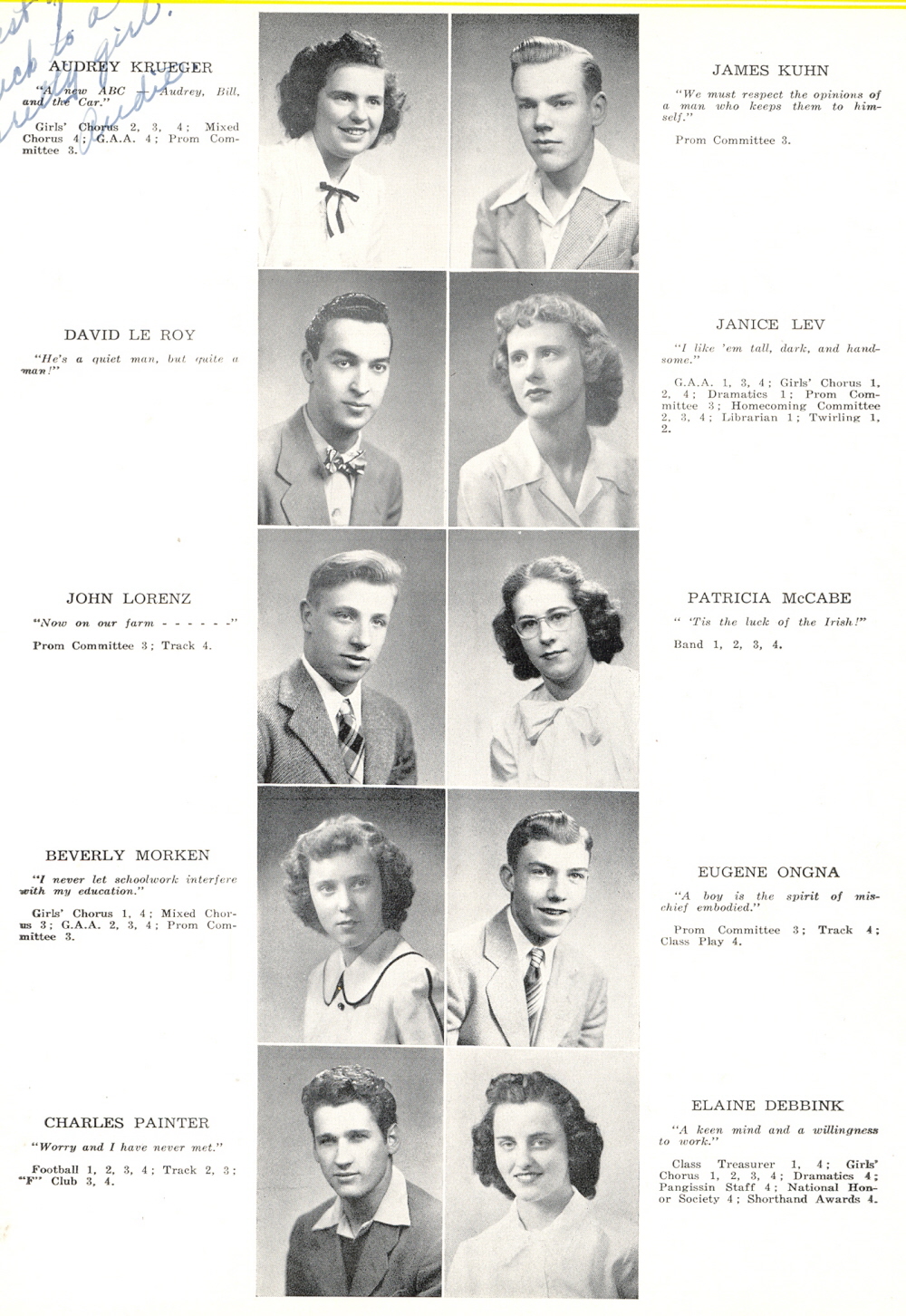 1948 Sheboygan Falls High School, Page 4: Audrey Krueger, James Kuhn, David Le Roy, Janice Lev, John Lorenz, Patricia McCabe, Beverly Morken, Eugene Ongna, Charles Painter, Elaine Debbink.