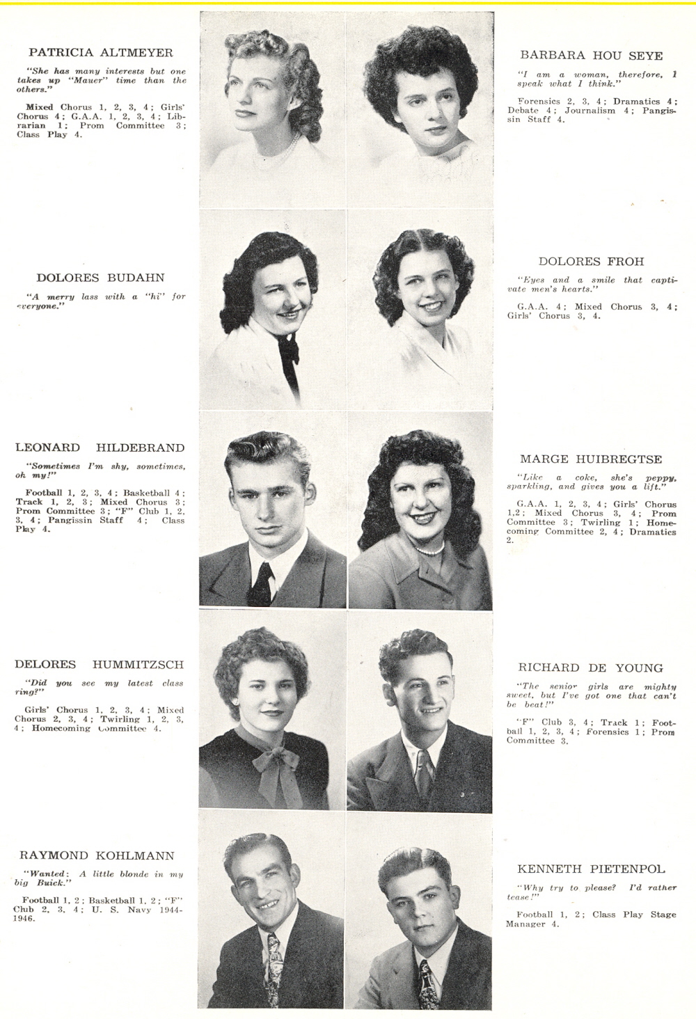 1948 Sheboygan Falls High School, Page 5: Audrey Krueger, James Kuhn, David Le Roy, Janice Lev, John Lorenz, Patricia McCabe, Beverly Morken, Eugene Ongna, Charles Painter, Elaine Debbink.