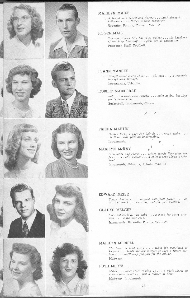 1948 Sheboygan North High School, Page 38: Marilyn Maier, Roger Mais, Joann Manske, Robert Markgraf, Frieda Martin, Marilyn McKay, Edward Meise, Gladys Melger, Marilyn Merrill, Ruth Mertz.