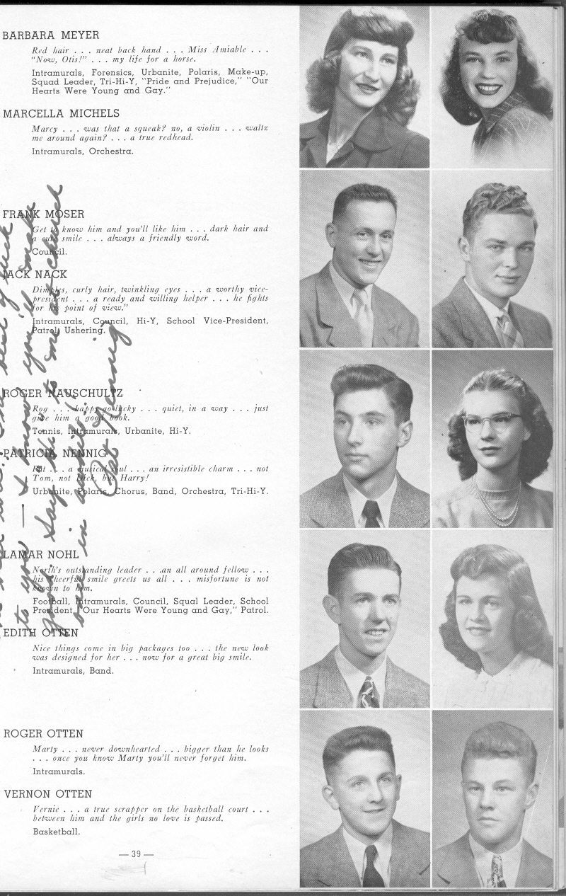 1948 Sheboygan North High School, Page 39: Barbara Meyer, Marcella Michels, Frank Moser, Jack Nack, Roger Nauschultz, Patricia Nennig, Lamar Nohl, Edith Otten, Roger Otten, Vernon Otten.