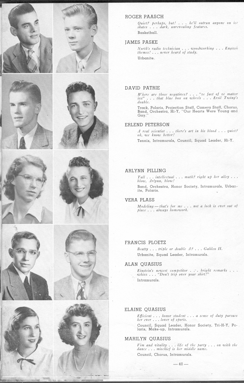 1948 Sheboygan North High School, Page 40: Roger Paasch, James Paske, David Patrie, Erlend Peterson, Arlynn Pilling, Vera Plass, Francis Ploetz, Alan Quasius, Elaine Quasius, Marilyn Quasius.