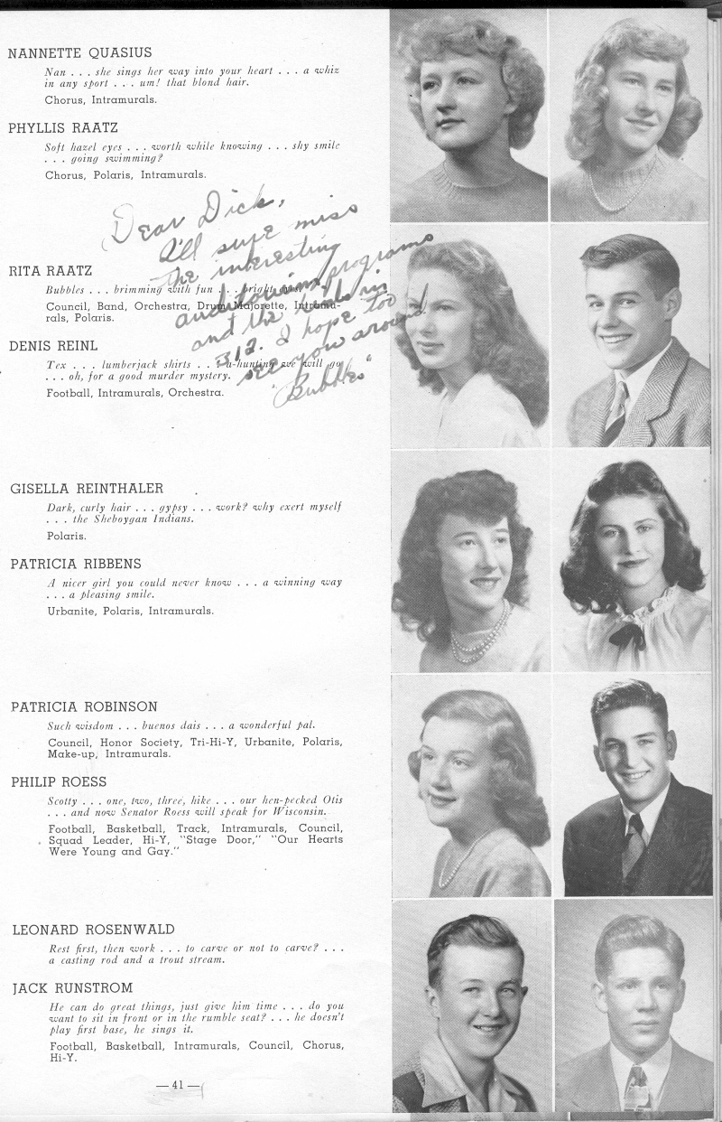 1948 Sheboygan North High School, Page 41: Nannette Quasius, Phyllis Raatz, Rita Raatz, Denis Reinl, Gisella Reinthaler, Patricia Ribbens, Patricia Robinson, Philip Roess, Leonard Rosenwald, Jack Runstrom.