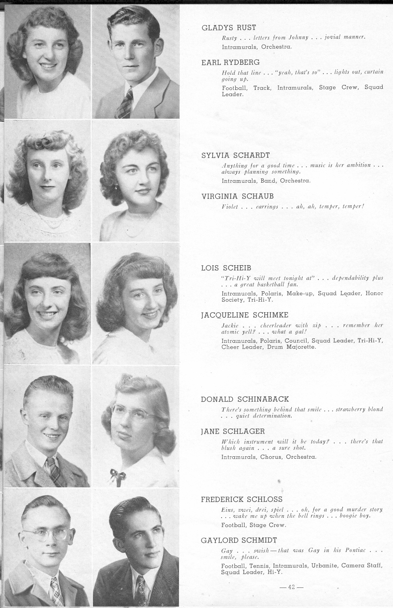 1948 Sheboygan North High School, Page 42: Gladys Rust, Earl Rydberg, Sylvia Schardt, Virginia Schaub, Lois Scheib, Jacqueline Schimke, Donald Schinaback, Jane Schlager, Frederick Schloss, Gaylord Schmidt.