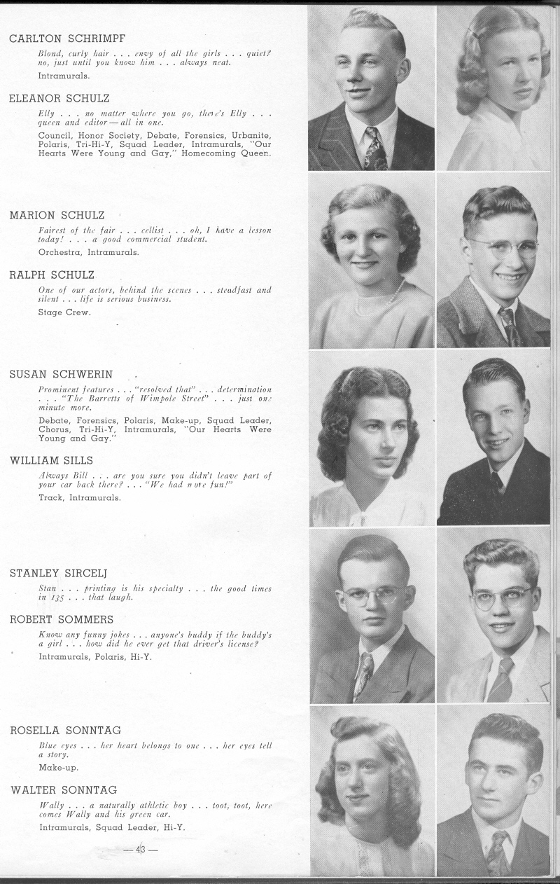 1948 Sheboygan North High School, Page 43: Carlton Schrimpf, Eleanor Schulz, Marion Schulz, Ralph Schulz, Susan Schwerin, William Sills, Stanley Sircelj, Robert Sommers, Rosella Sonntag, Walter Sonntag.