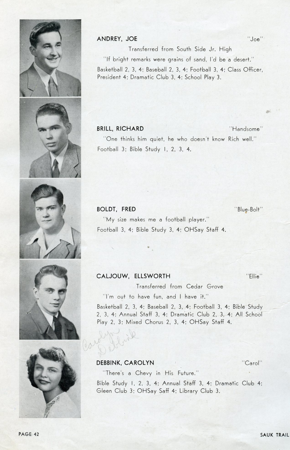 1949 Oostburg High School Yearbook Page 42: Joe Andrey, Richard Brill, Fred Boldt, Ellsworth Caljouw, Carolyn Debbink.