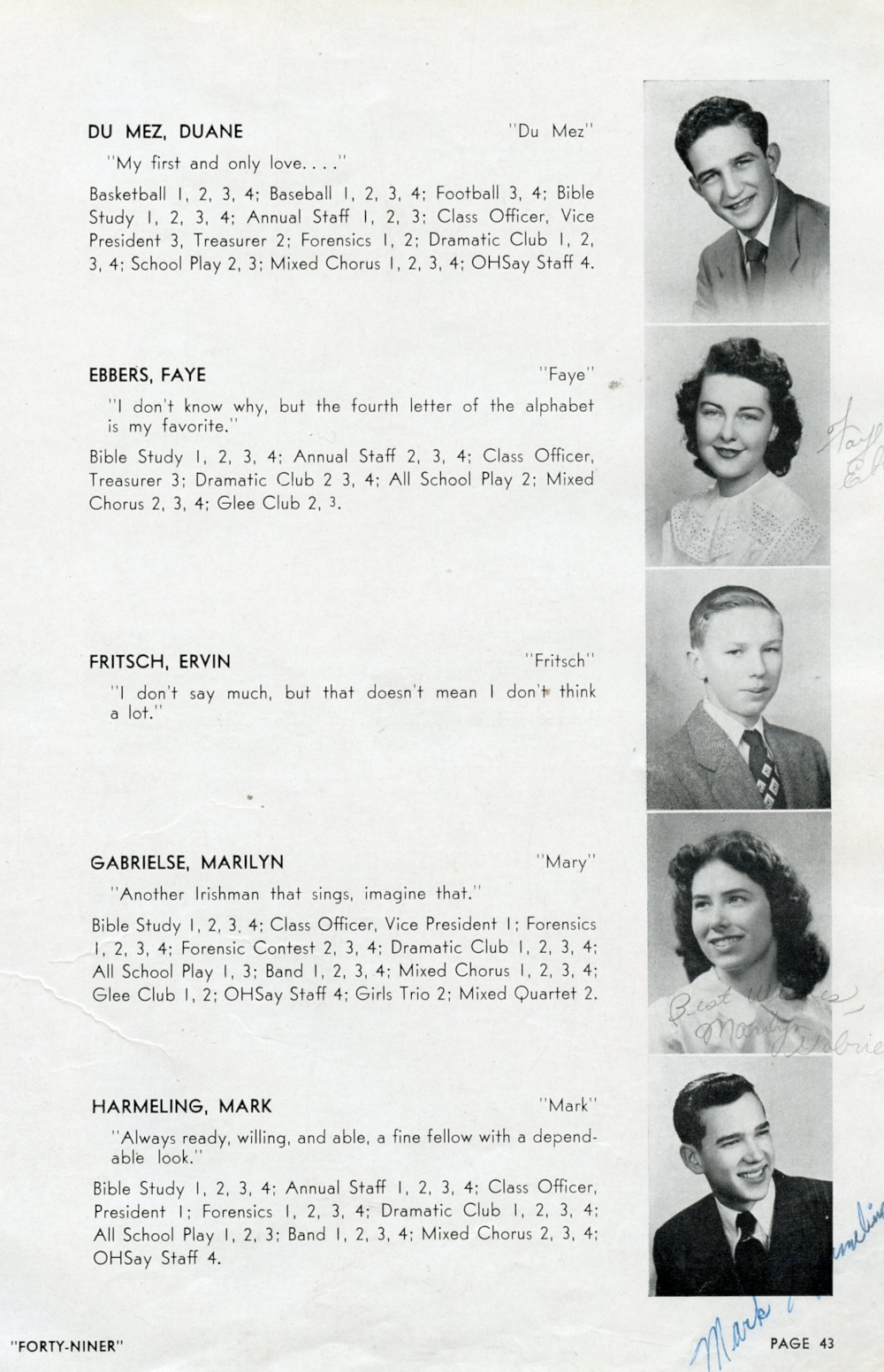 1949 Oostburg High School Yearbook Page 43: Duane Du Mez, Faye Ebbers, Ervin Fritsch, Marilyn Gabrielse, Mark Harmeling.