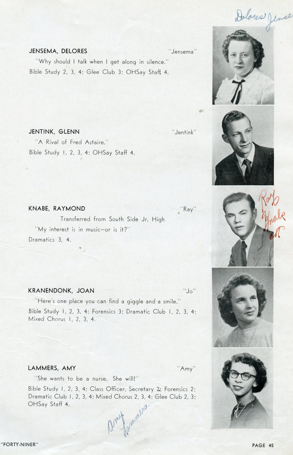 1949 Oostburg High School Yearbook Page 45: Delores Jensema, Glenn Jentink, Raymond Knabe, Joan Kranendonk, Amy Lammers.