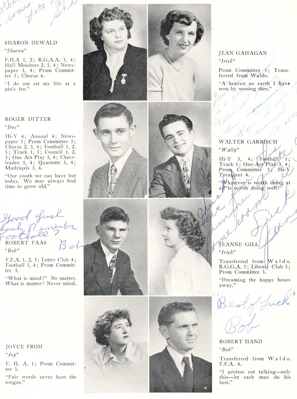 1949 Plymouth High School, Page 23: Sharon Dewald, Roger Ditter, Robert Faas, Joyce Froh, Jean Gahagan, Walter Garbisch, Jeanne Gill, Robert Hand.