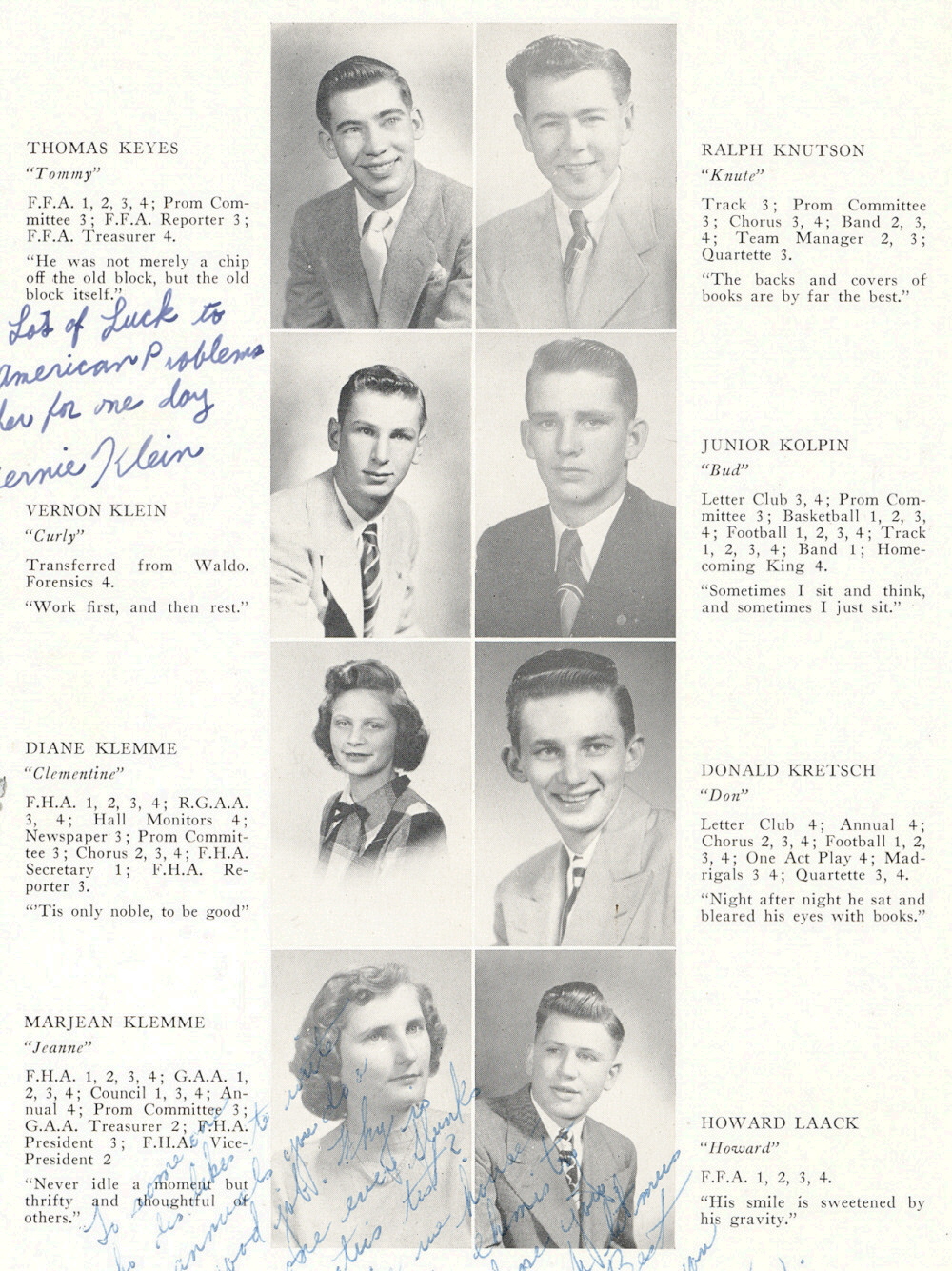 1949 Plymouth High School, Page 26: Thomas Keyes, Vernon Klein, Diane Klemme, Marjean Klemme, Ralph Knutson, Junior Kolpin, Donald Kretsch, Howard Laack.
