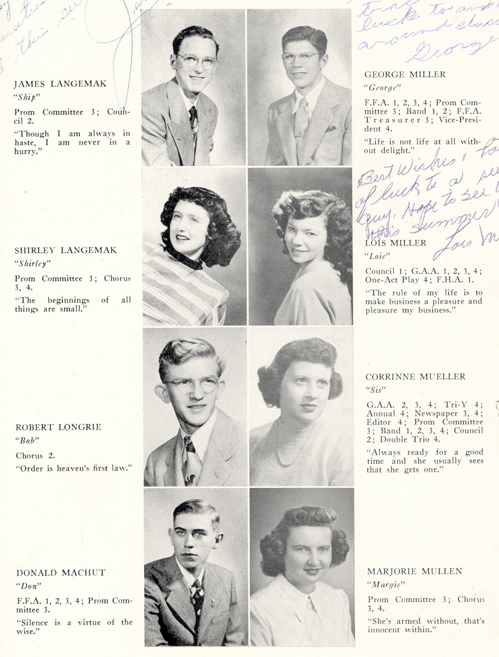 1949 Plymouth High School, Page 27: James Langemak, Shirley Langemak, Robert Longrie, Donald Machut, George Miller, Lois Miller, Corrinne Mueller, Marjorie Mullen.