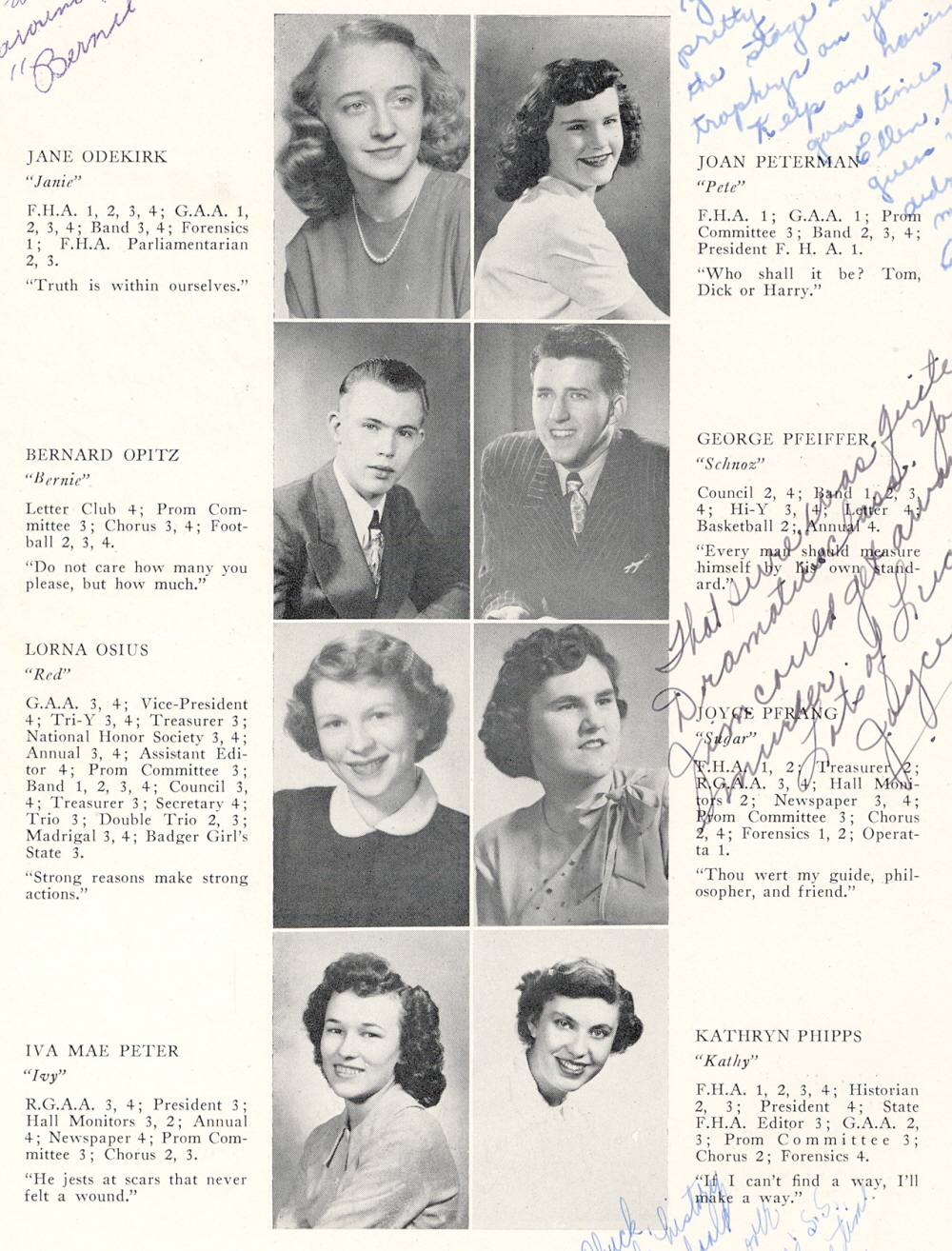 1949 Plymouth High School, Page 28: Jane Odekirk, Bernard Opitz, Lorna Osius, Iva Mae Peter, Joan Peterman, George Pfeiffer, Joyce Pfrang, Kathryn Phipps.