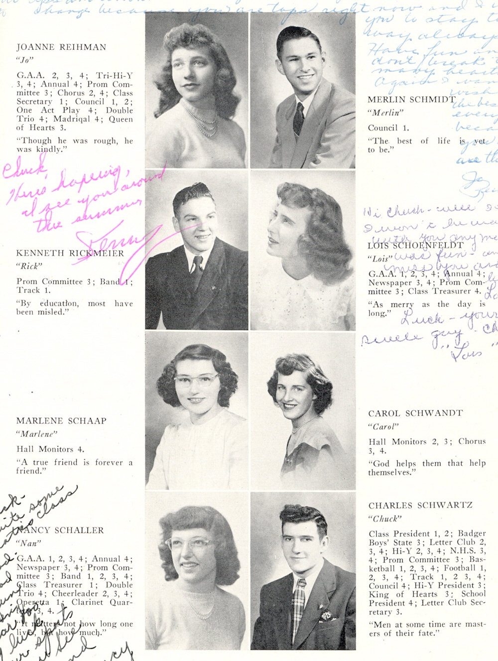 1949 Plymouth High School, Page 29: Joyce Reihman, Kenneth Rickmeier, Marlene Schaap, Nancy Schaller, Merlin Schmidt, Lois Schoenfeldt, Carol Schwandt, Charles Schwartz.