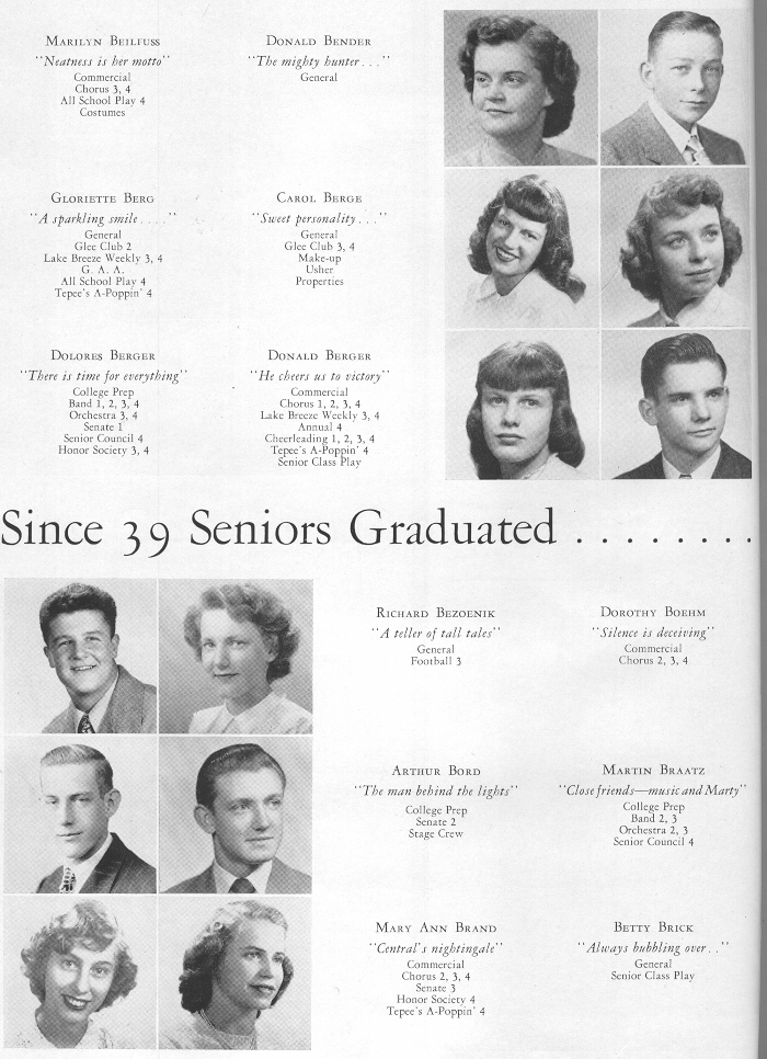 1949 Sheboygan Central High School, Page 22: Marilyn Beiliuss, Donald Bender, Gloriette Berg, Carol Berge, Dolores Berger, Donald Berger, Richard Bezoenik, Dorothy Boehm, Arthur Bord, Martin Braatz, Mary Ann Brand, Betty Brick.