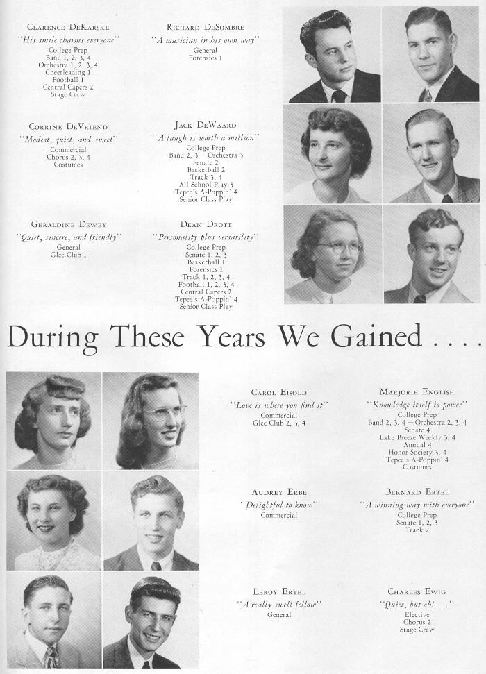 1949 Sheboygan Central High School, Page 25: Clarence DeKarske, Richard DeSombre, Corrine DeVriend, Jack DeWaard, Geraldine Dewey, Dean Drott, Carol Eisold, Marjorie English, Audrey Erbe, Bernard Ertel, Leroy Ertel, Charles Ewig.