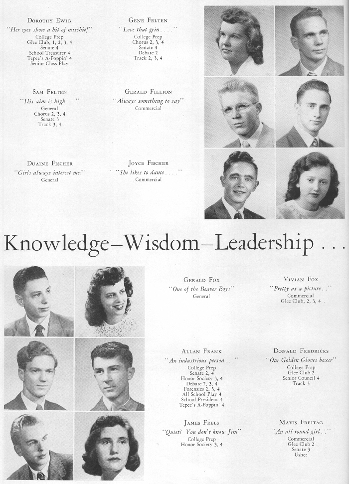 1949 Sheboygan Central High School, Page 26: Dorothy Ewig, Gene Felten, Sam Felten, Gerald Fillion, Duaine Fischer, Joyce Fischer, Gerald Fox, Vivian Fox, Allan Frank, Donald Fredricks, James Frees, Mavis Freitag.