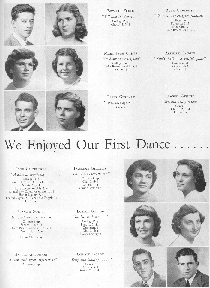 1949 Sheboygan Central High School, Page 27: Edward Freye, Ruth Gabrielse, Mary Jane Gasser, Ardelle Gauger, Peter Gerhart, Rachel Gessert, Ione Gilbertson, Darlene Gillette, Frances Goebel, Loella Goking, Harold Goldmann, Gerald Gorde.