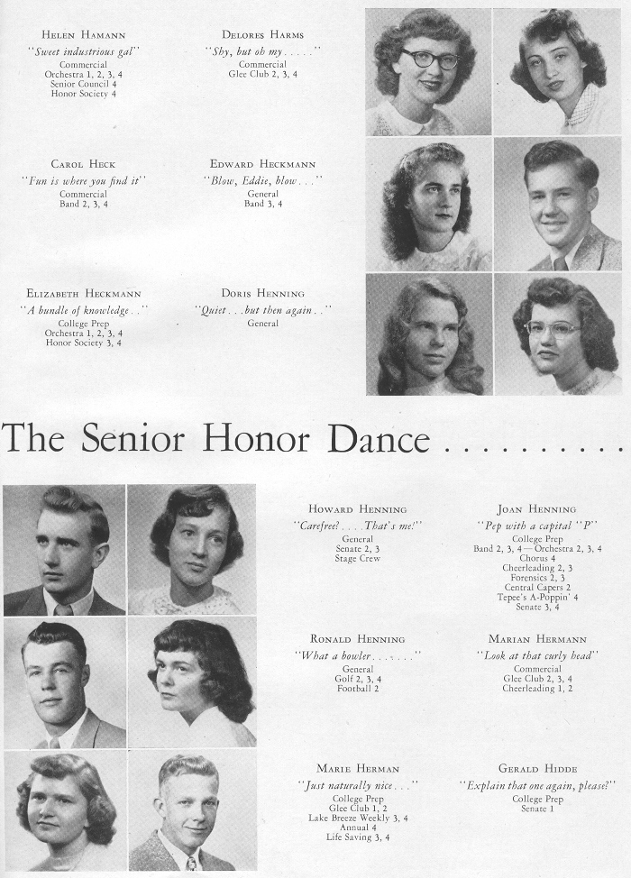 1949 Sheboygan Central High School, Page 29: Helen Hamann, Delores Harms, Carol Heck, Edward Heckmann, Elizabeth Heckmann, Doris Henning, Howard Henning, Joan Henning, Ronald Henning, Marian Hermann, Marie Herman, Gerald Hidde.