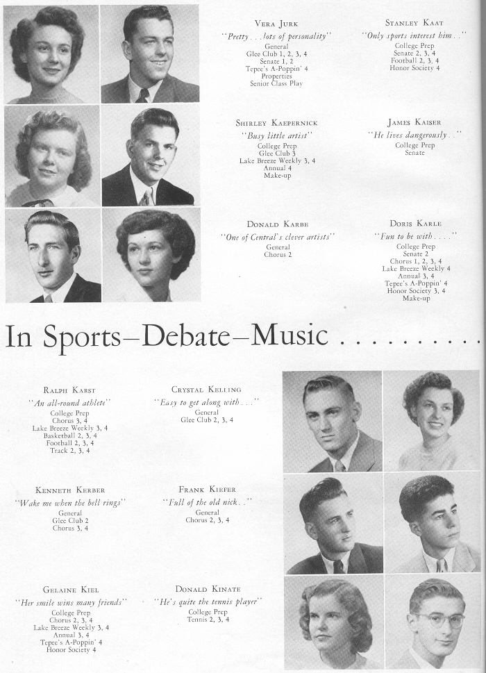 1949 Sheboygan Central High School, Page 32: Vera Jurk, Stanley Kaat, Shirley Kaepernick, James Kaiser, Donald Karbe, Doris Karle, Ralph Karst, Crystal Kelling, Kenneth Kerber, Frank Kiefer, Gelaine Kiel, Donald Kinate.