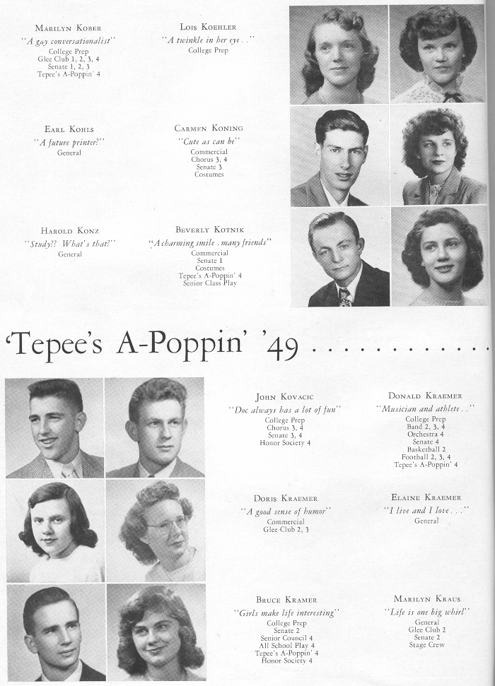 1949 Sheboygan Central High School, Page 34: Marilyn Kober, Lois Koehler, Earl Kohls, Carmen Koning, Harold Konz, Beverly Kotnik, John Kovacic, Donald Kraemer, Doris Kraemer, Elaine Kraemer, Bruce Kramer, Marilyn Kraus.