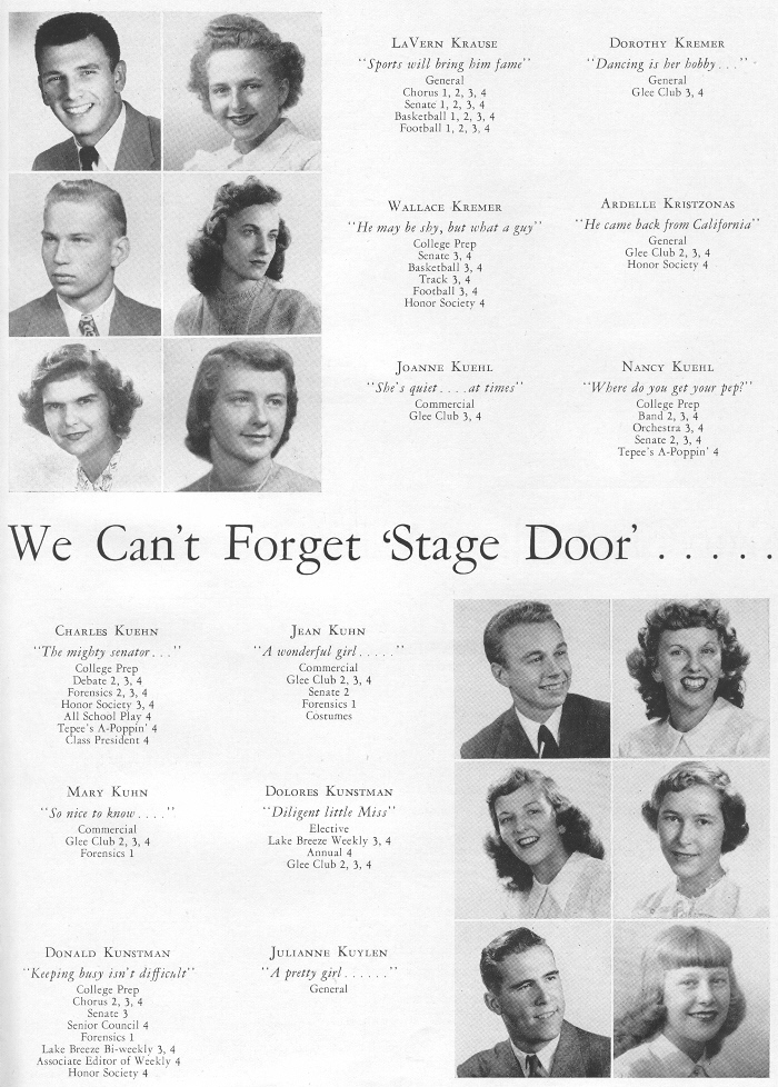 1949 Sheboygan Central High School, Page 35: LaVern Krause, Dorothy Kremer, Wallace Kremer, Ardelle Kristzonas, Joanne Kuehl, Nancy Kuehl, Charles Kuehn, Jean Kuhn, Mary Kuhn, Dolores Kunstman, Donald Kunstman, Julianne Kuylen.
