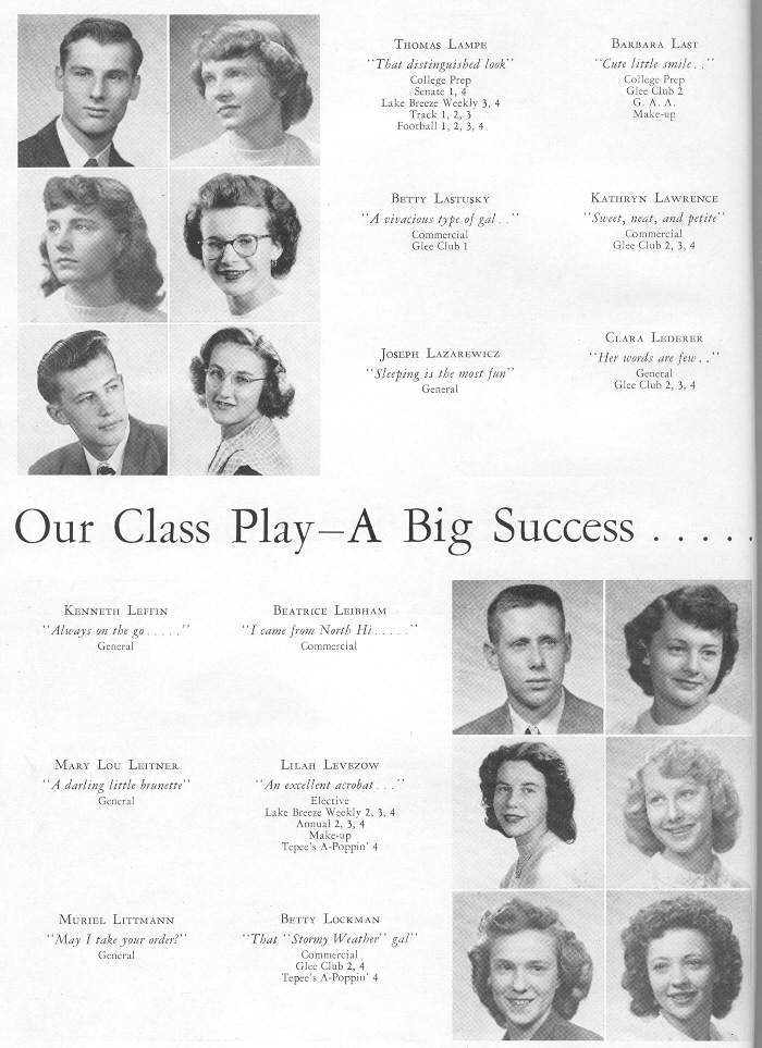 1949 Sheboygan Central High School, Page 36: Thomas Lampe, Barbara Last, Betty Lastusky, Kathryn Lawrence, Joseph Lazarewicz, Glara Lederer, Kenneth Leffin, Beatrice Leibham, Mary Lou Leitner, Lilah Levezow, Muriel Littmann, Betty Lockman.