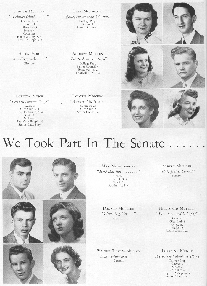 1949 Sheboygan Central High School, Page 38: Carmen Moehrke, Earl Mondloch, Helen Moos, Andrew Morken, Loretta Mosch, Dolores Moschko, Max Muehlberger, Albert Mueller, Donald Mueller, Hildegard Mueller, Walter Mulloy, Lorraine Mundt.