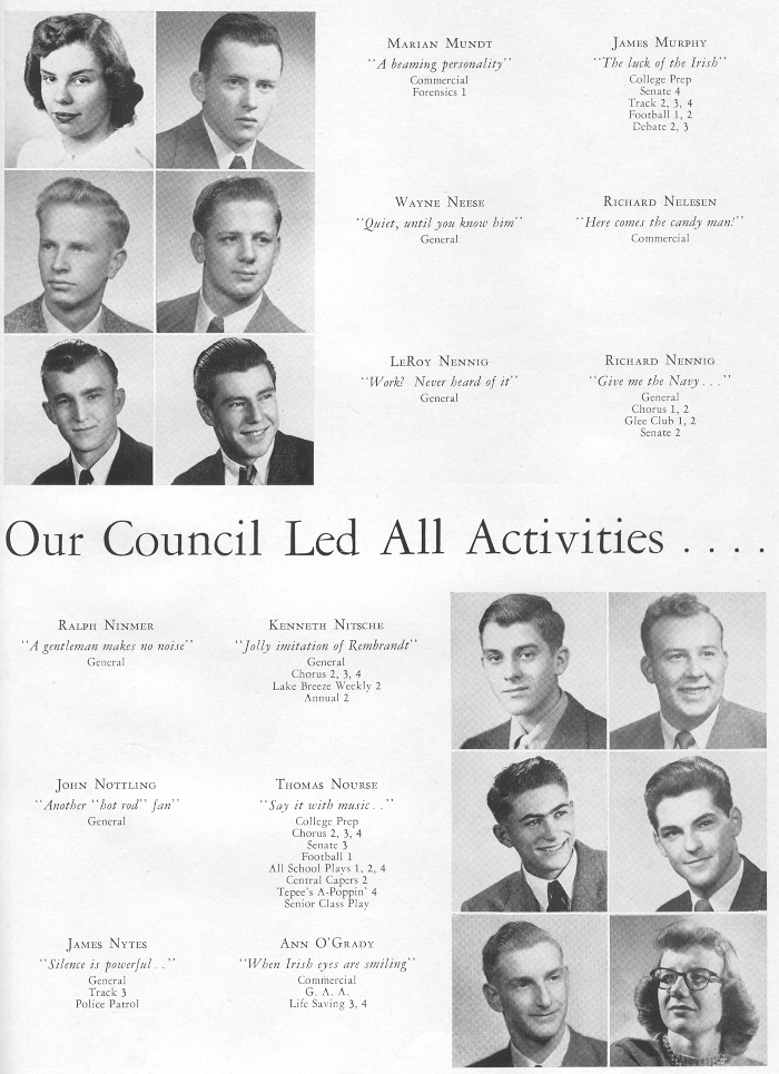 1949 Sheboygan Central High School, Page 39: Marian Mundt, James Murphy, Wayne Neese, Richard Nelesen, LeRoy Nennig, Richard Nennig, Ralph Ninmer, Kenneth Nitsche, John Nottling, Thomas Nourse, James Nytes, Ann O'Grady.