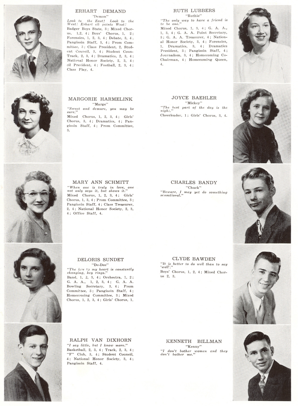 1949 Sheboygan Falls High School, Page 5: Erhart Demand, Ruth Lubbers, Margorie Harmelink, Joyce Baehler, Mary Ann Schmitt, Charles Bandy, Deloris Sundet, Clyde Bawden, Ralph Van Dixhorn, Kenneth Billman.