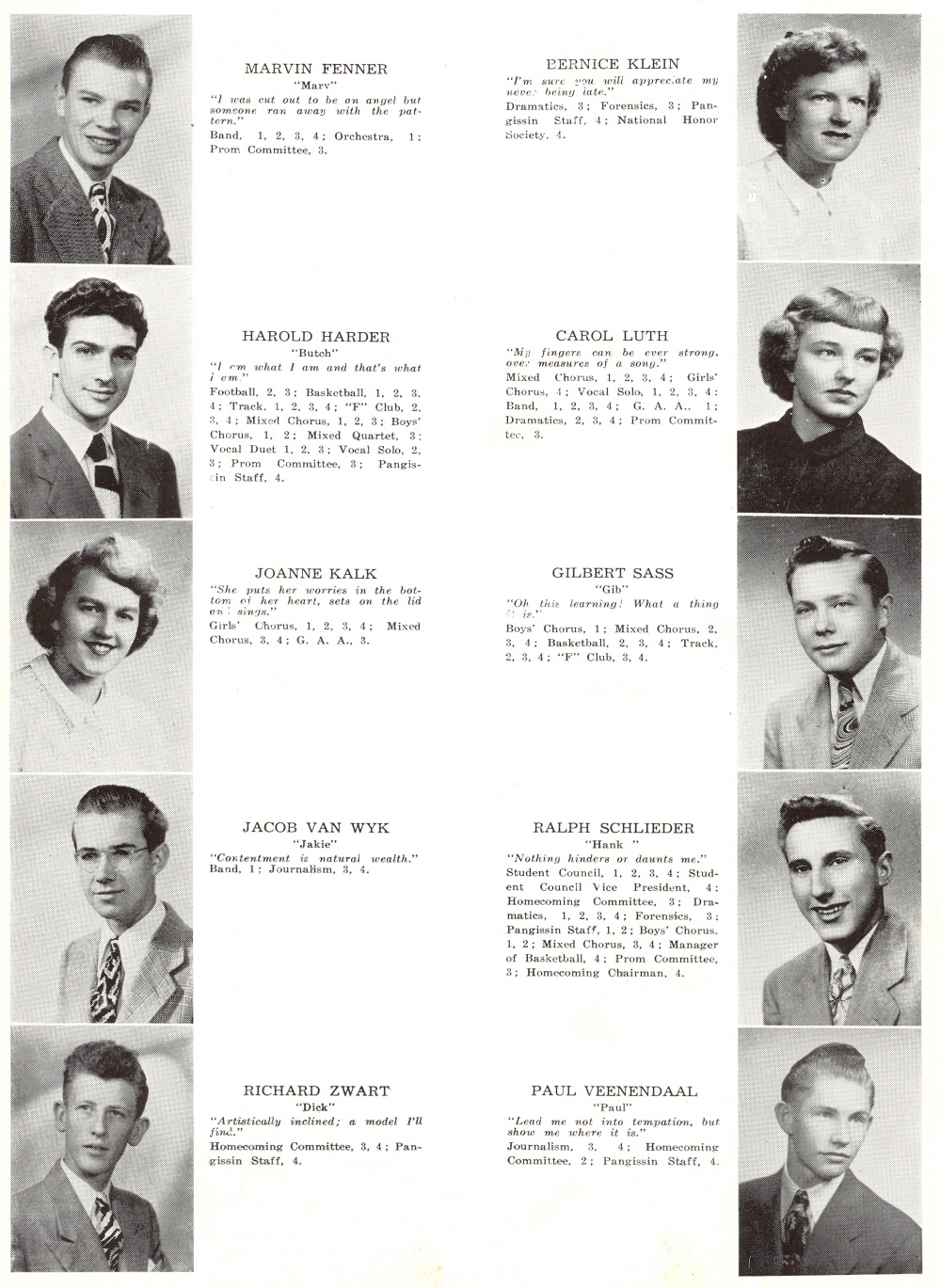 1949 Sheboygan Falls High School, Page 7: Marvin Fenner, Bernice Klein, Harold Harder, Carol Luth, Joanne Kalk, Gilbert Sass, Jacob Van Wyk, Ralph Schlieder, Richard Zwart, Paul Veenendaal.