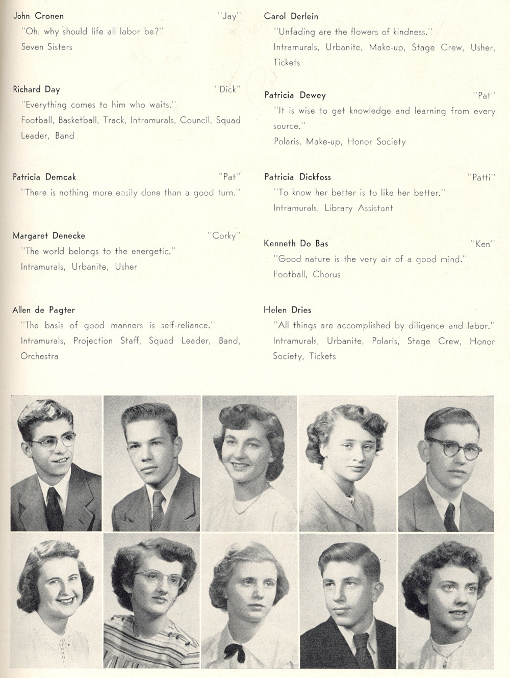 1949 Sheboygan North High School, Page 27: John Cronen, Richard Day, Patricia Demcak, Margaret Denecke, Allen de Pagter, Carol Derlein, Patricia Dewey, Patricia Dickfoss, Kenneth Do Bas, Helen Dries.