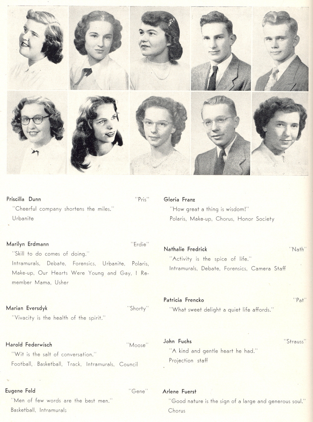 1949 Sheboygan North High School, Page 28: Priscilla Dunn, Marilyn Erdmann, Marian Eversdyk, Harold Federwisch, Eugene Feld, Gloria Franz, Nathalie Fredrick, Patricia Frencko, John Fuchs, Arlene Fuerst.