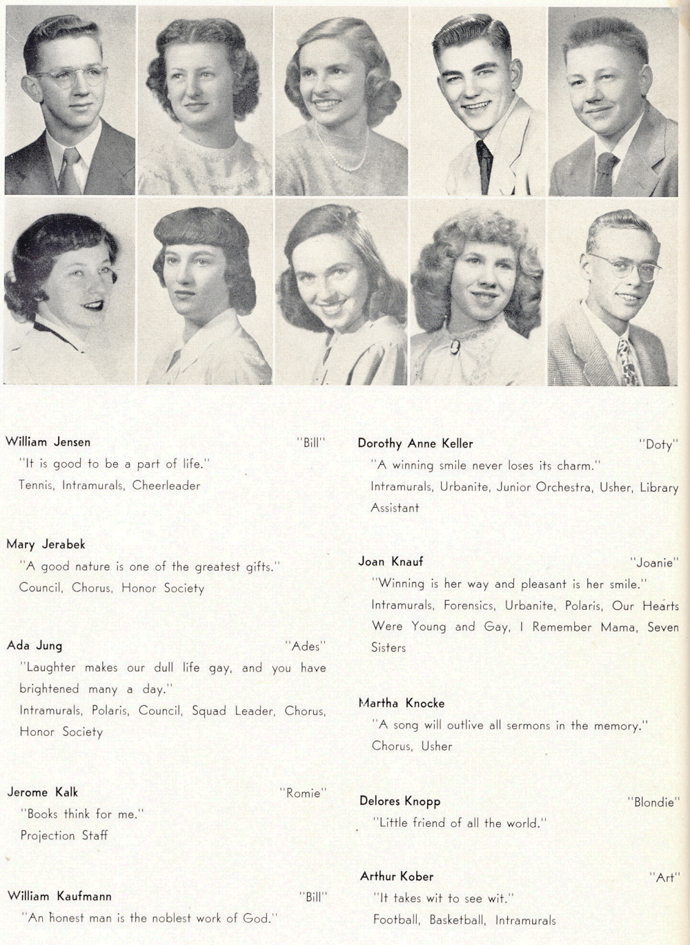 1949 Sheboygan North High School, Page 32: William Jensen, Mary Jerabek, Ada Jung, Jerome Kalk, William Kaufmann, Dorothy Keller, Joan Knauf, Martha Knocke, Delores Knopp, Arthur Kober.