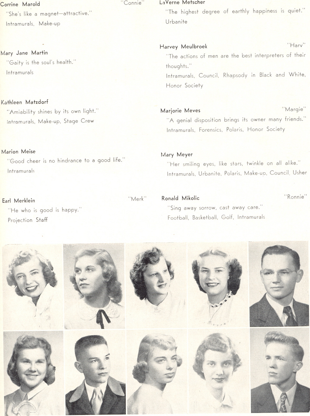 1949 Sheboygan North High School, Page 35: Corrine Marold, Mary Martin, Kathleen Matzdorf, Marion Meise, Earl Merklein, LaVerne Metscher, Harvey Meulbroek, Marjorie Meves, Mary Meyer, Ronald Mikolic.