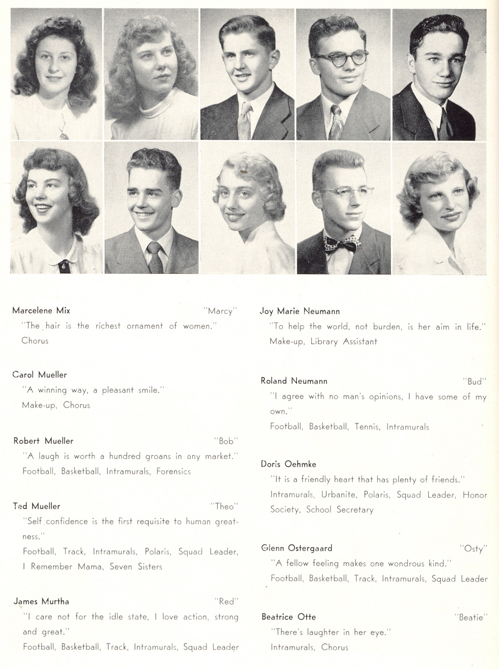 1949 Sheboygan North High School, Page 36: Mercelene Mix, Carol Mueller, Robert Mueller, Ted Mueller, James Murtha, Joy Neumann, Roland Neumann, Doris Oehmke, Glenn Ostergaard, Beatrice Otte.