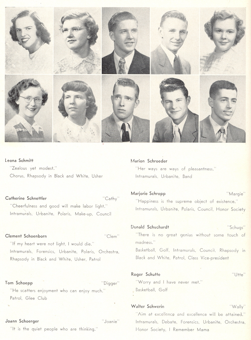 1949 Sheboygan North High School, Page 40: Leona Schmitt, Catherine Schnettler, Clement Schoenborn, Tom Schoepp, Joann Schoerger, Marion Schroeder, Marjorie Schropp, Donald Schuchardt, Roger Schutte, Walter Schwerin.